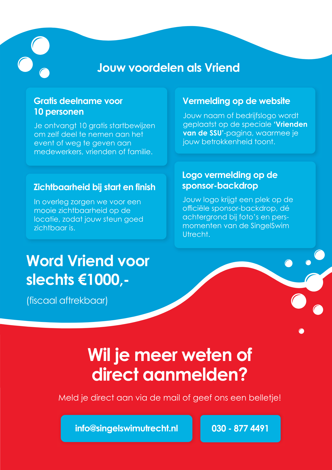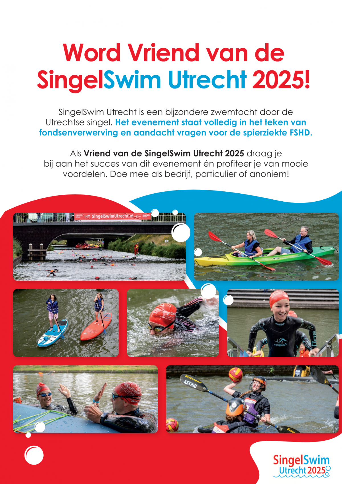 SingelSwim Utrecht is een bijzondere zwemtocht door de Utrechtse singel. Het evenement staat volledig in het teken van fondsenwerving en aandacht vragen voor de spierziekte FSHD. Als vriend van de SSU 2025 draag je bij aan het succes van dit evenement én profiteer je van mooie voordelen. Doe mee als bedrijf, partculier of anoniem!